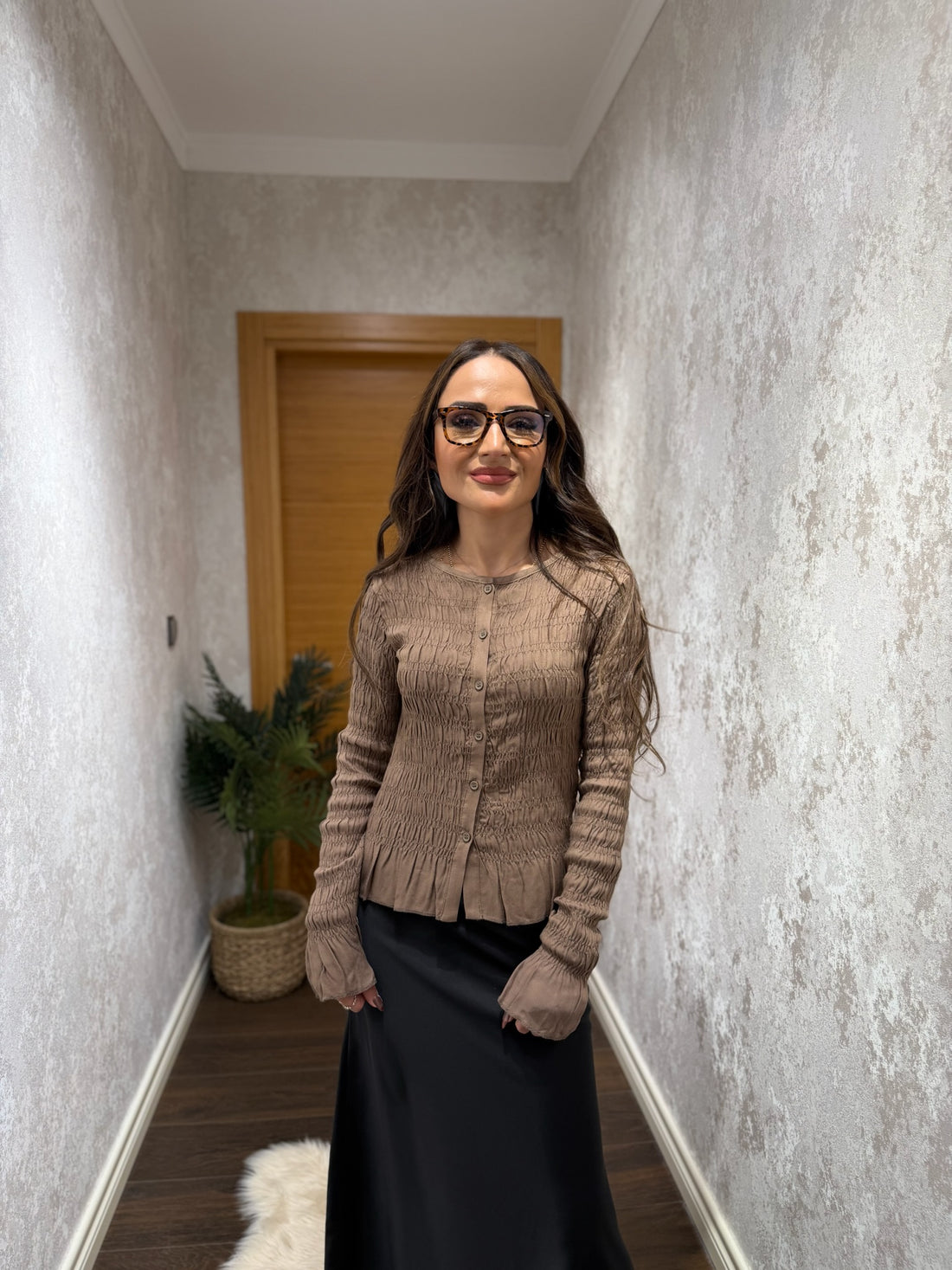 V Yaka Asimetrik Düğmeli Uzun Kollu Bluz