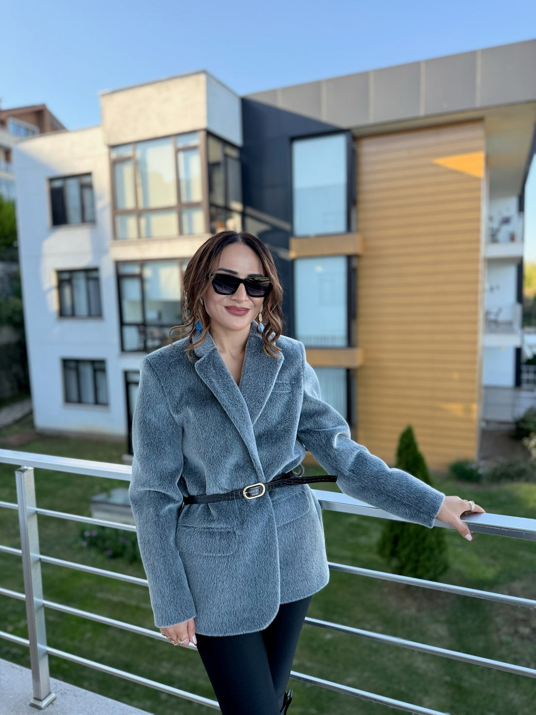 Kemerli Gri Yünlü Dış Giyim Ceket