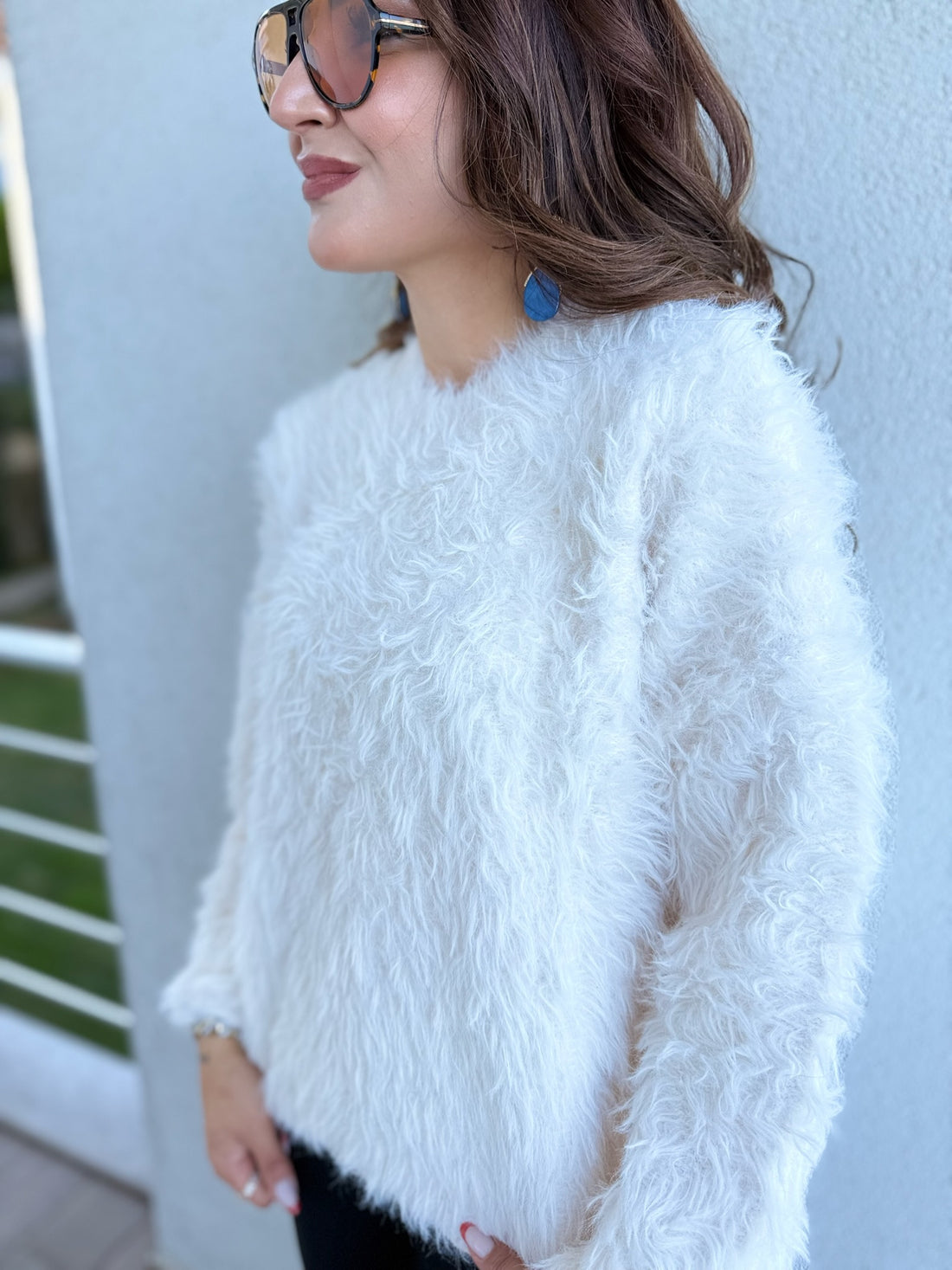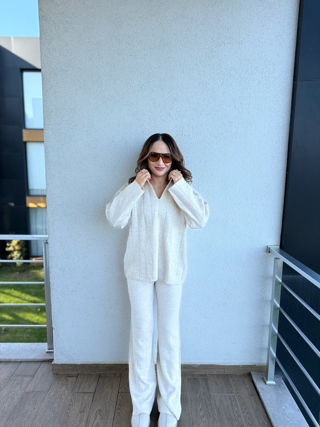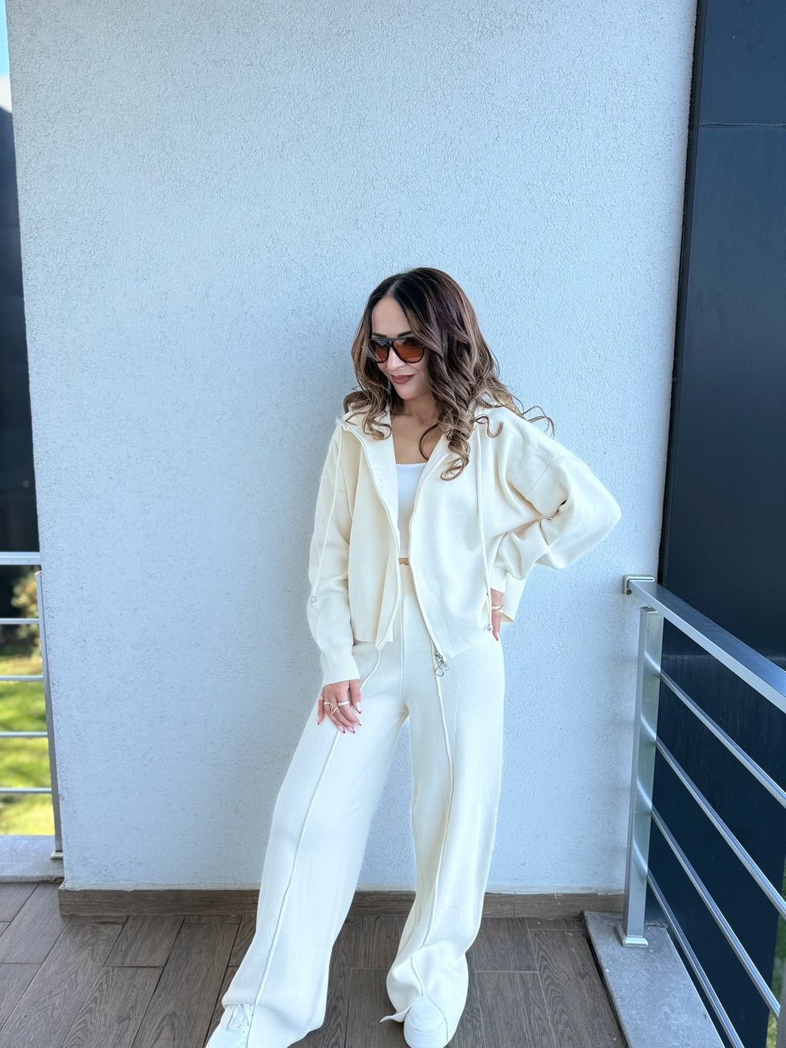 Fermuarlı Kapüşonlu Ekru Triko Takım