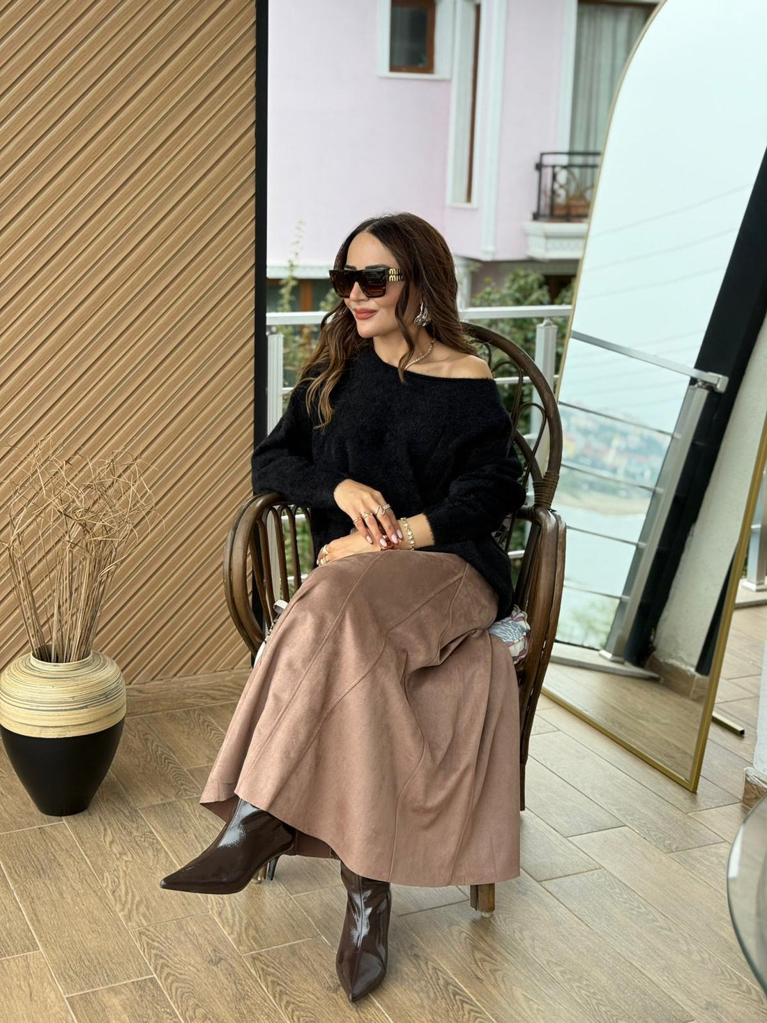 Açık Kahve Yüksek Bel Pile Detaylı Midi Etek