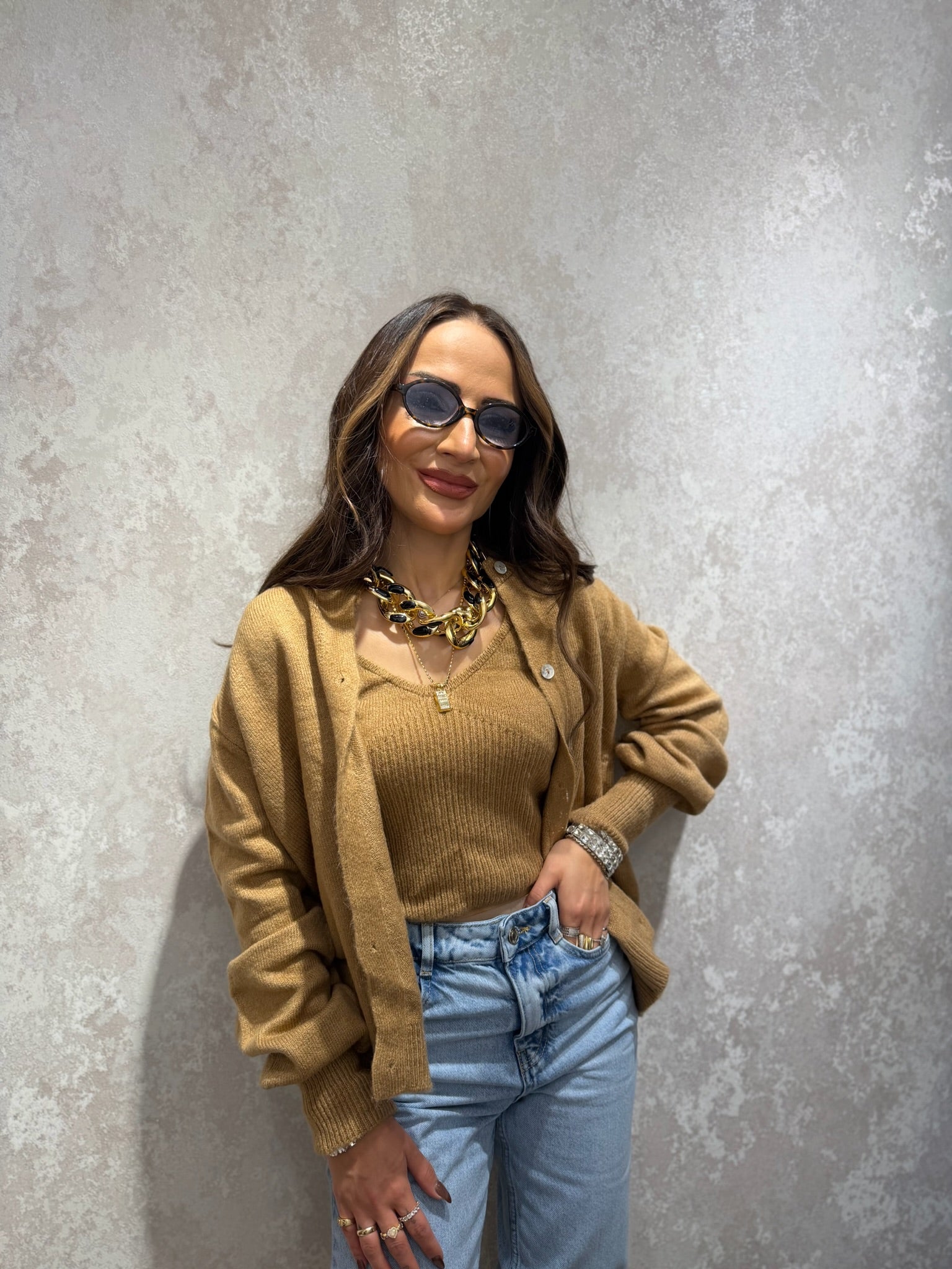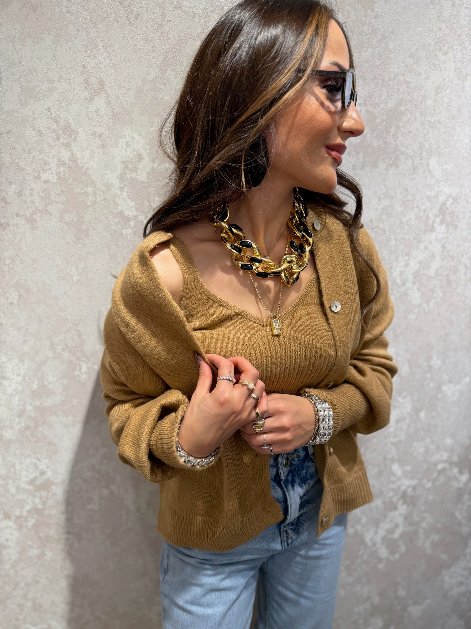 Zamansız şıklığı ve konforu bir arada sunan bu özel takım; yumuşak dokulu hırka ve uyumlu büstiyerden oluşur. Günlük kombinlerde zahmetsiz bir şıklık sunarken, şehir stiline de kolayca uyum sağlar. Birlikte kullanıldığında bütünlüklü bir görünüm, ayrı ayrı kullanıldığında ise çok yönlü kombin imkânı sunar.