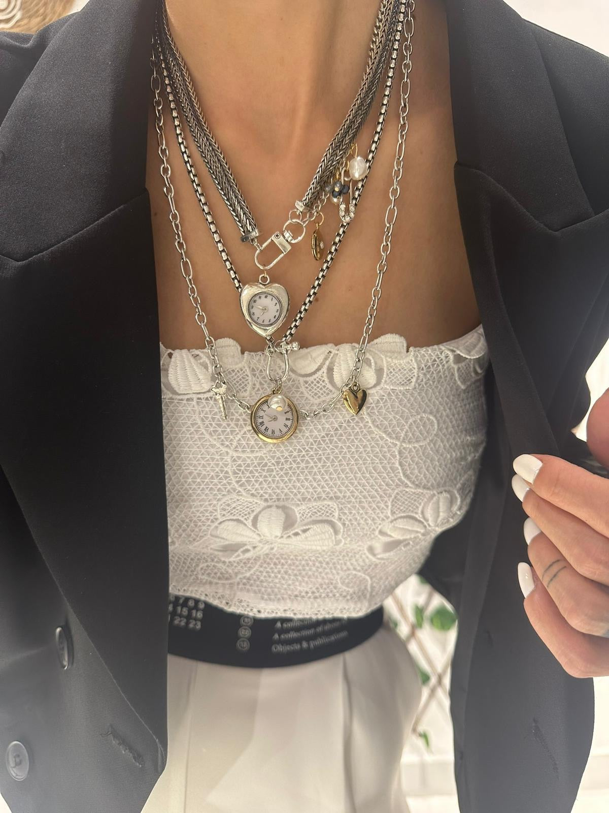 Çoklu Zincir Detaylı Saat Uçlu Çelik Kolye Seti