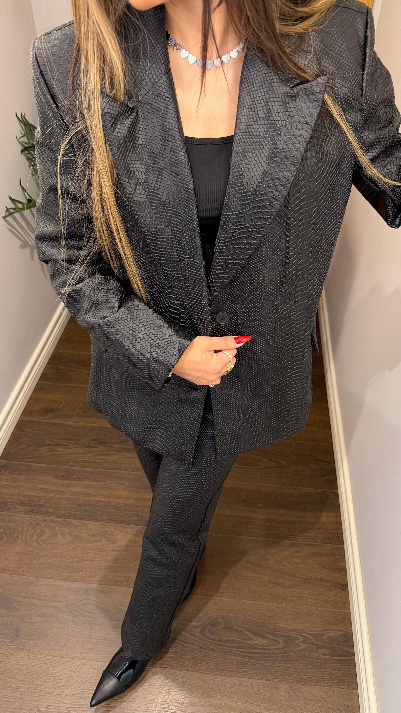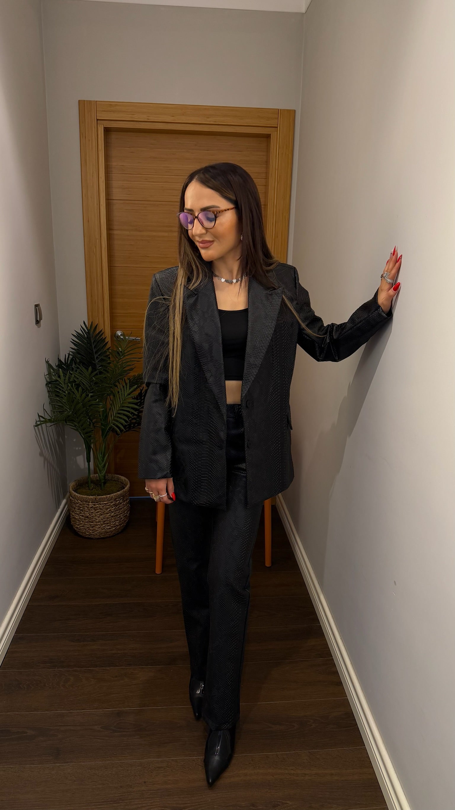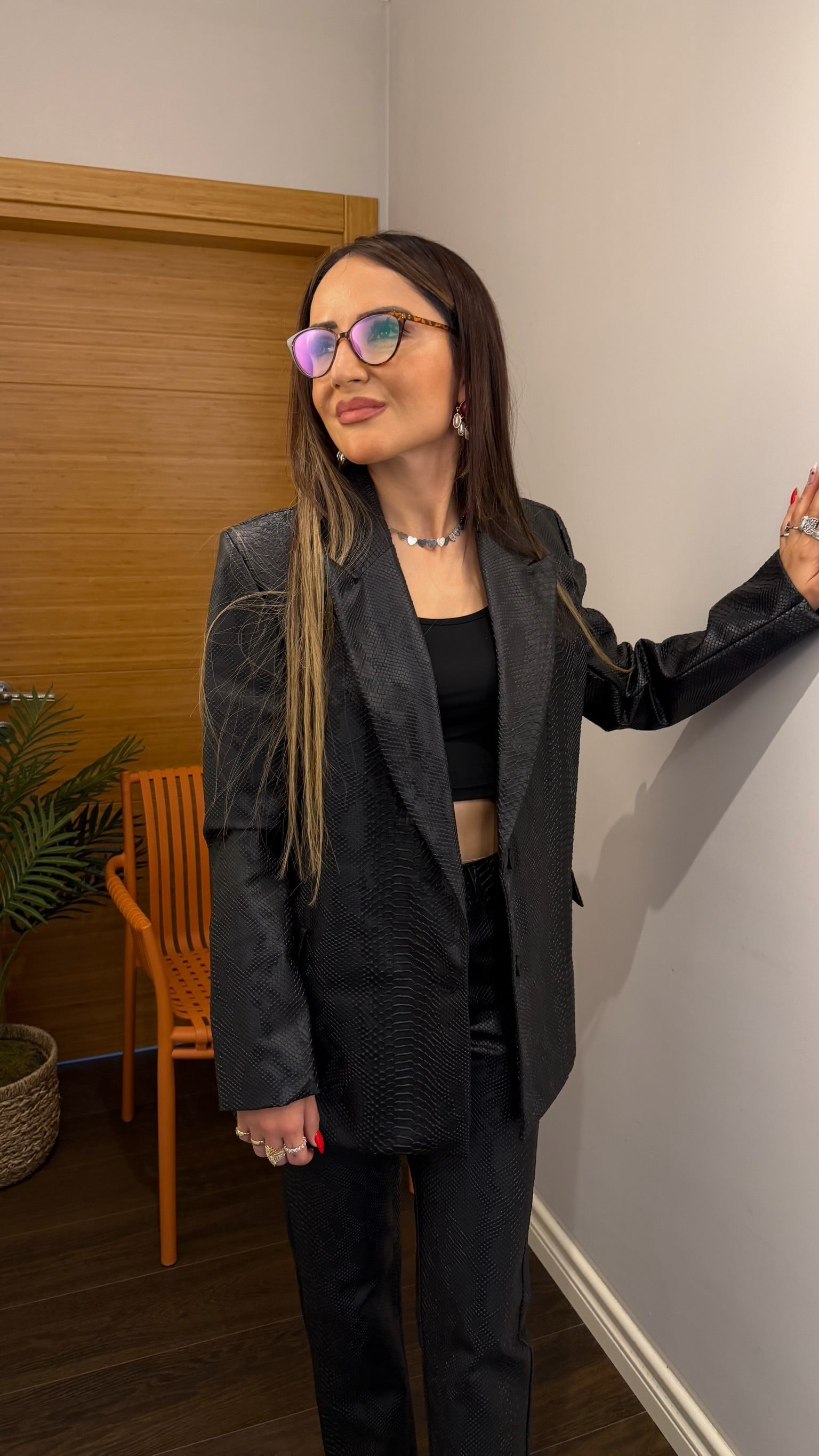 Dokulu Deri Görünümlü Ceket & Pantolon Takım