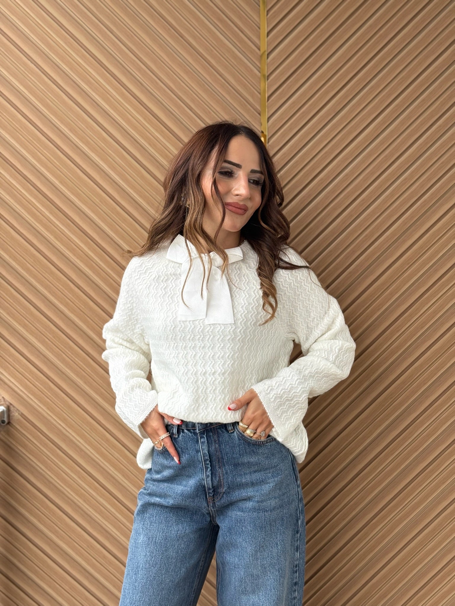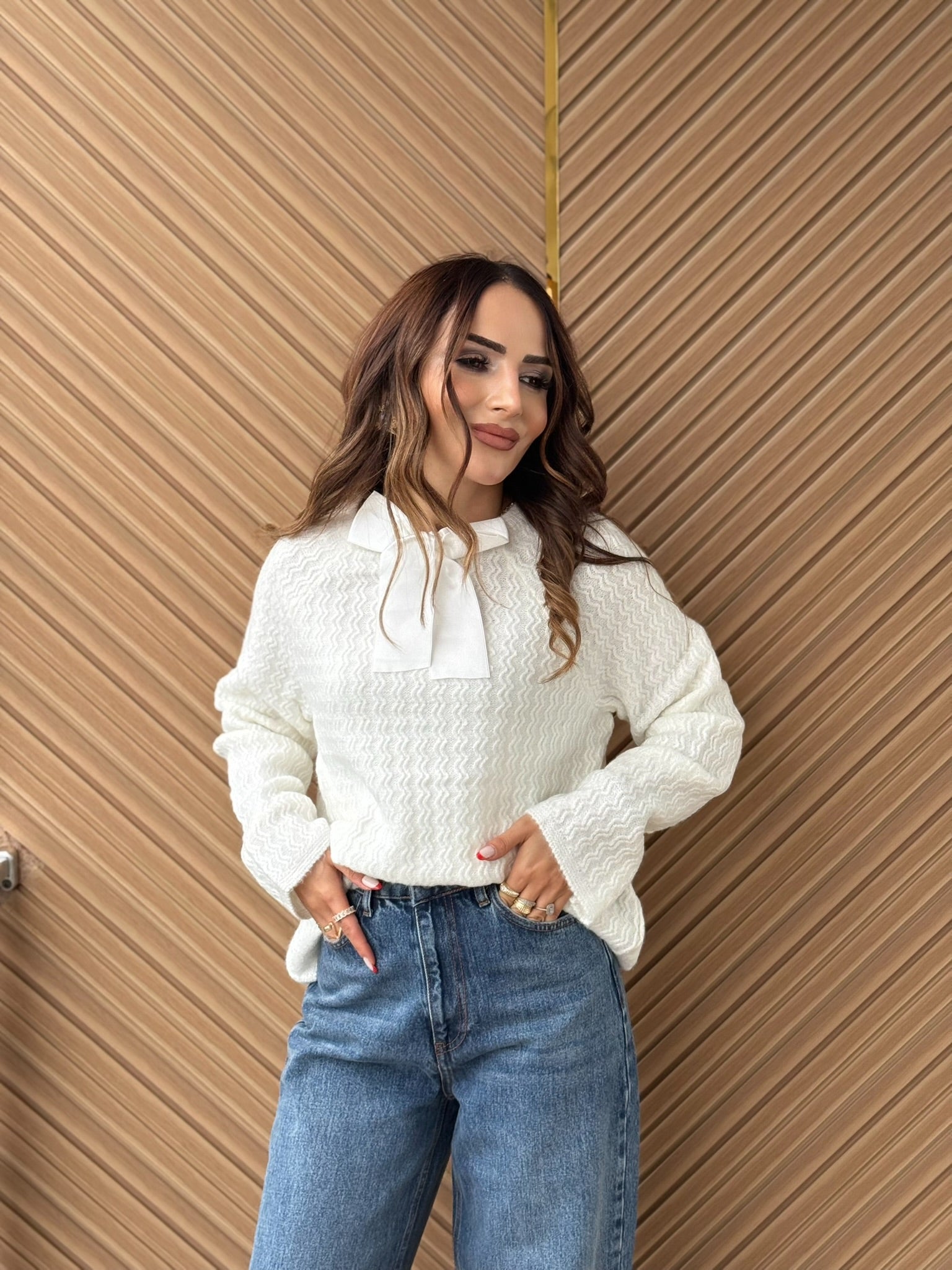 Şıklığı küçük ama etkili detaylarla tamamlayan fular detaylı triko kazak, zarif ve modern bir görünüm sunar. Boyun kısmındaki bağlama/fular detayı sayesinde klasik trikoya farklı ve stil sahibi bir dokunuş kazandırır.