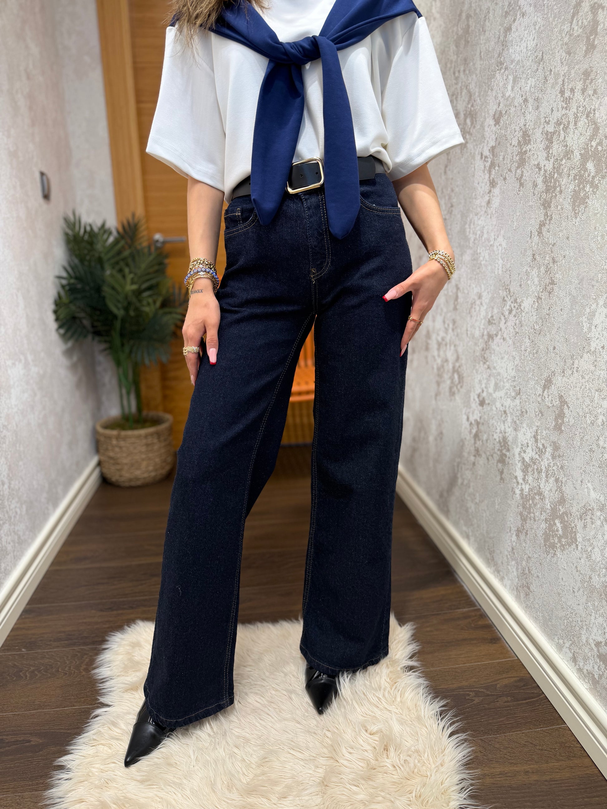Şıklığı ve rahatlığı bir arada sunan koyu lacivert jean pantolon, modern kesimiyle günlük kombinlerin vazgeçilmez parçalarından biridir. Yüksek bel formu sayesinde vücut hatlarını dengeli gösterirken, geniş paça tasarımı hareket özgürlüğü ve konfor sağlar.